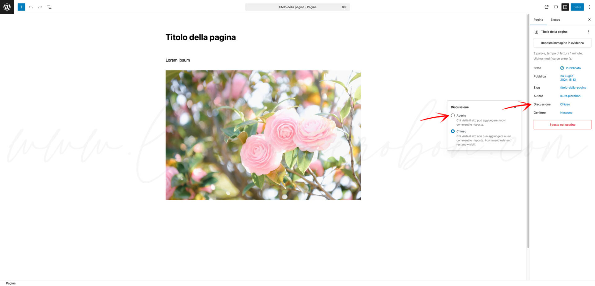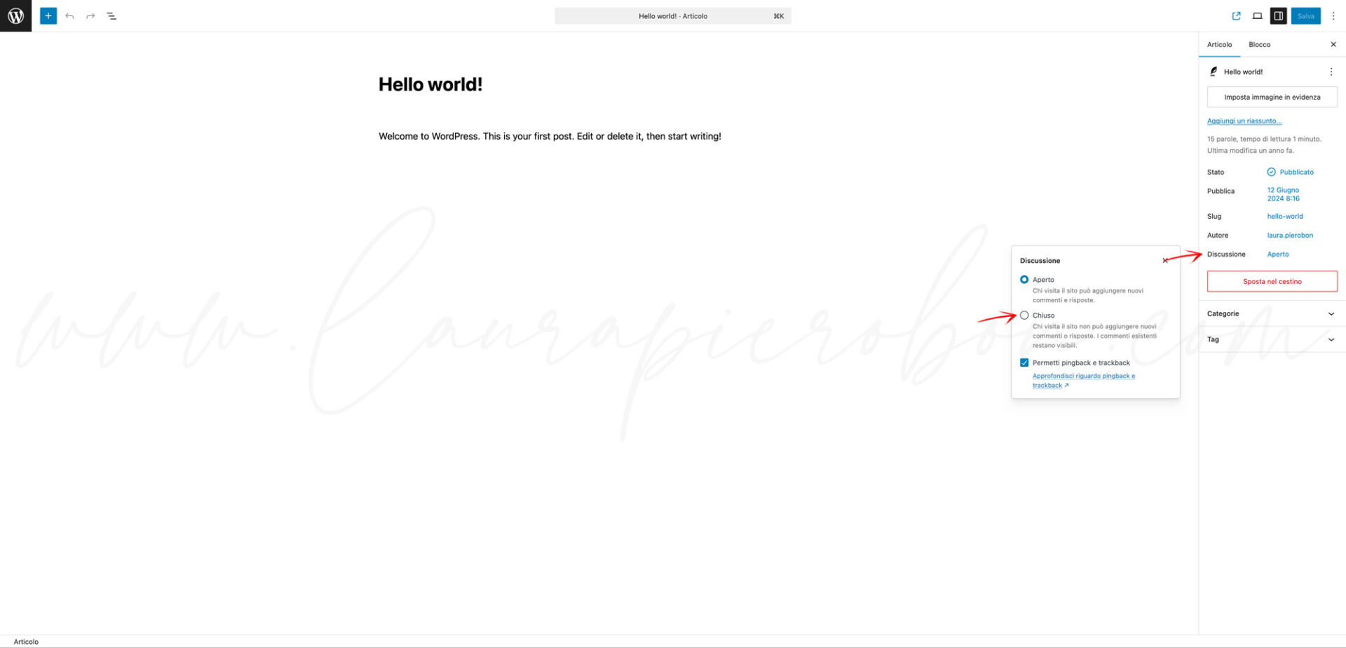 - Ti si aprirà un pop up dove potrai selezionare la voce “Chiuso” per non permettere agli utenti di commentare l’articolo