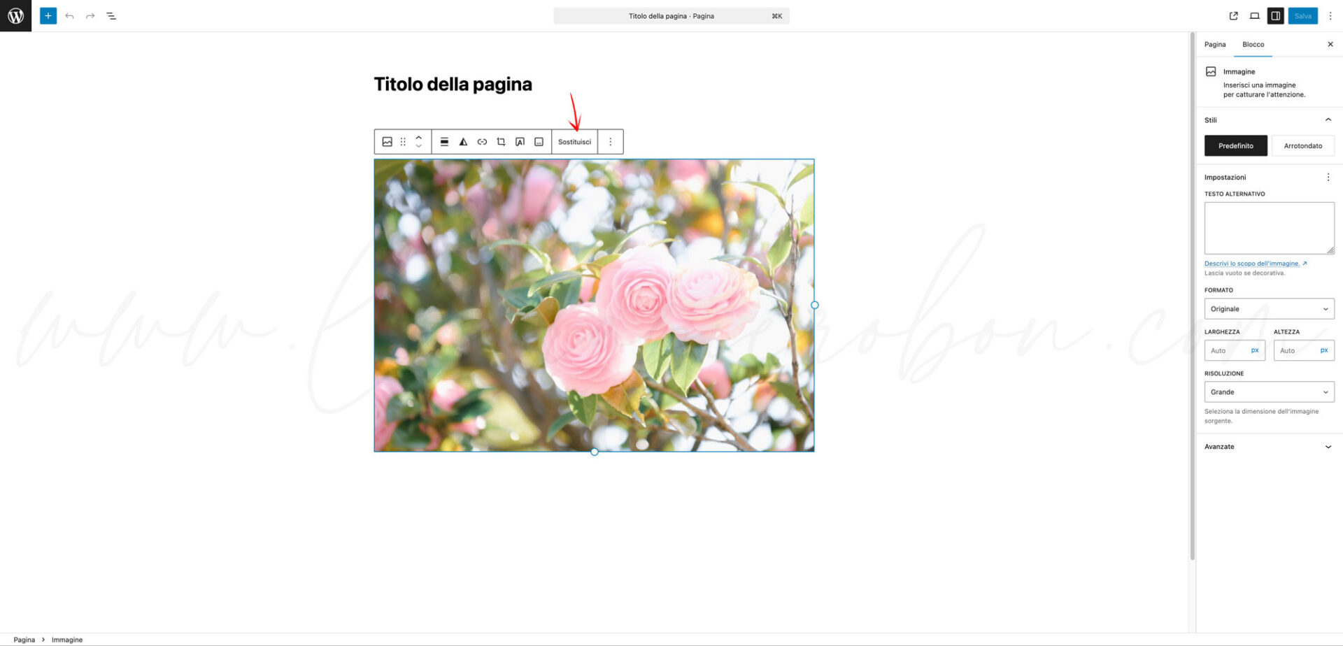 - Clicca sull’immagine che vuoi aggiornare, seleziona “Sostituisci” e scegli la nuova immagine dal gestore dei media oppure caricane una nuova