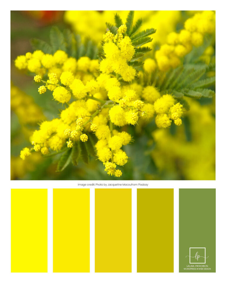 Una palette ispirata alla mimosa, simbolo di forza e rinascita. Toni giallo-verdi che trasmettono calore e positività al tuo sito WordPress e al tuo brand femminile.
