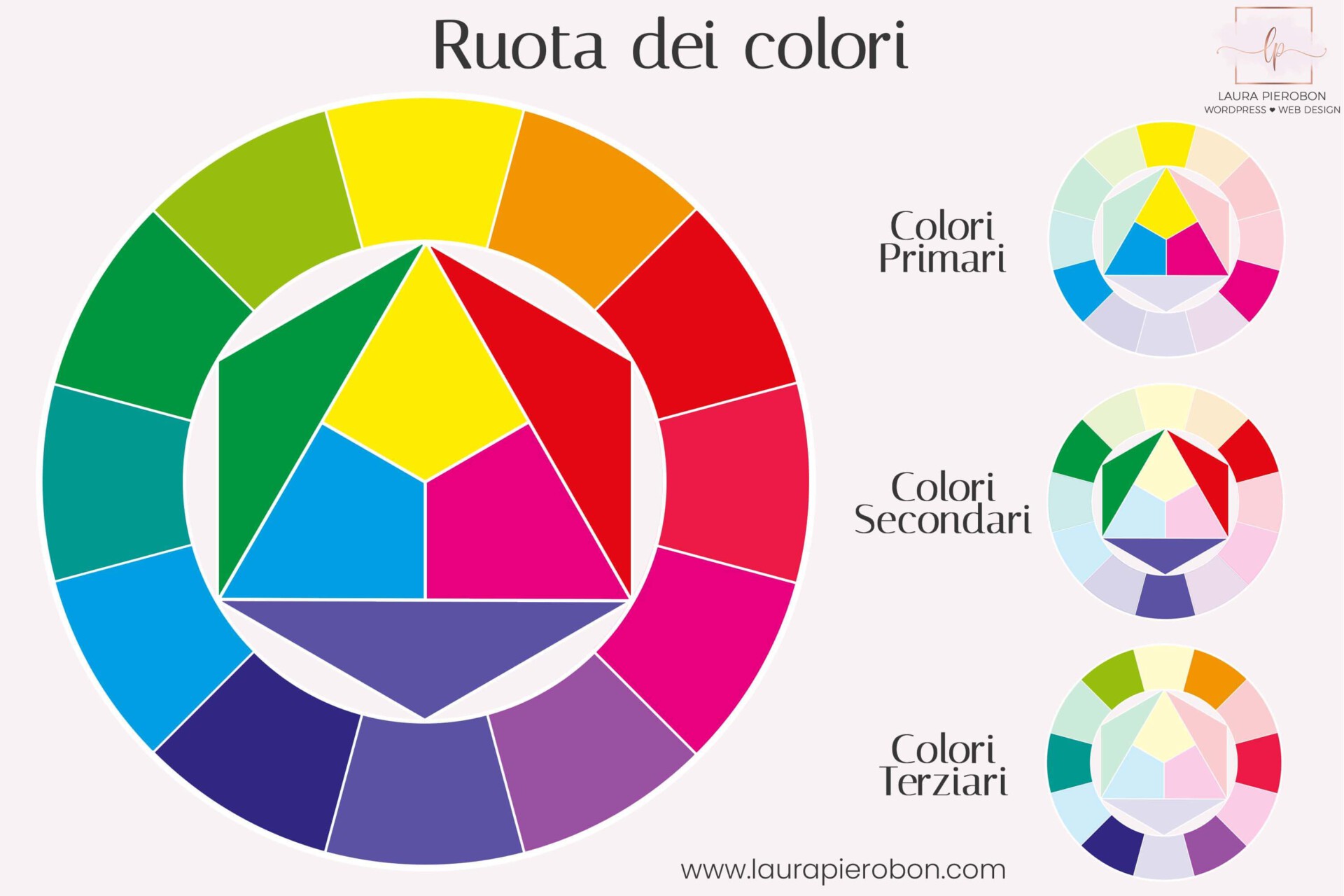 Questi colori, disposti in cerchio, formano la “ruota dei colori” o “cerchio cromatico”, uno strumento visivo molto utile per scegliere gli accostamenti cromatici. Guardandola, puoi capire facilmente quali colori sono “vicini”, “opposti” o “complementari”.